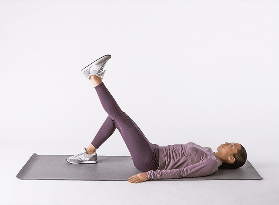 در حالت خوابیده، یک پا خم، پای تمرینی صاف. پا را بالا بیاور، ۵ ثانیه نگه دار، آرام پایین بیاور.